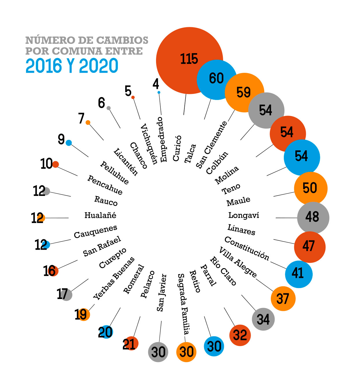 En una mirada comunal, se observa que la comuna de Curicó registra el mayor número de cambios con un total de 115 estudiantes, seguida por las comunas de Talca, San Clemente, Teno, Molina, Colbún con más de 50 cada una. Por su parte, las que registran un menor número de cambios son las comunas de Empedrado, Vichuquén, Chanco, Licantén y Pelluhue con menos de 10 cambios en el periodo estudiado.