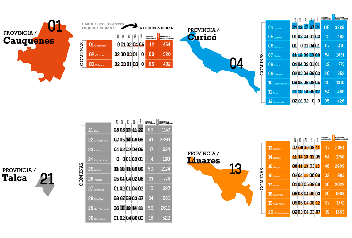 En la región de El Maule, entre los años 2016 y 2020, se cambiaron a una escuela rural un total de 945 estudiantes de 1º a 6 básico que iniciaron su trayectoria escolar en una escuela urbana, número que fue en aumento hasta el año 2019. Estos cambios se concentran, principalmente, en tres de las cuatro provincias de la región, donde la provincia de Curicó suma un total de 363 de los cambios, la provincia de Talca 312 y la provincia de Linares 297, mientras que Cauquenes 27 cambios.