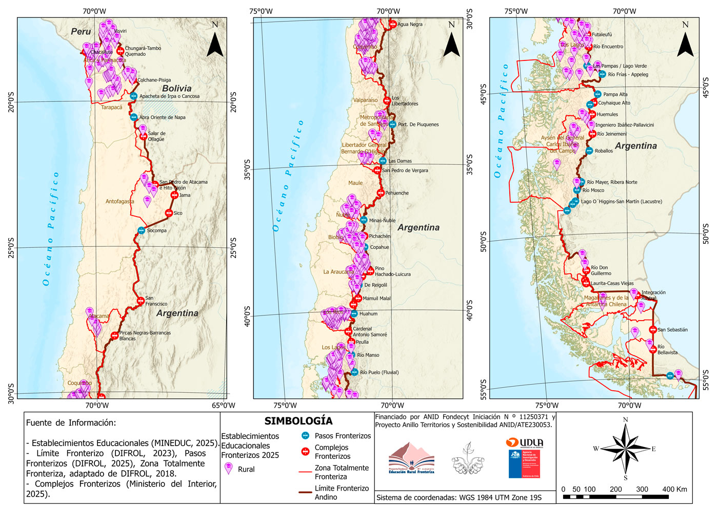 El mapa georreferencia todos los establecimientos educacionales rurales ubicados en comunas clasificadas por la Dirección Nacional de Fronteras y Límites del Estado (DIFROL) como “totalmente fronterizas” en la zona andina de Chile continental.